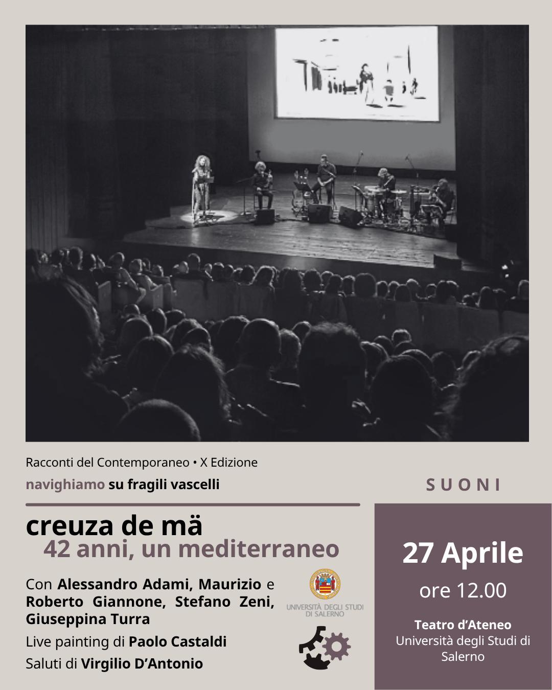 Tempi Moderni ritorna al Teatro d’Ateneo dell’Università degli Studi di Salerno (lunedì 27 aprile - ore 12.00) con una seconda tappa della rassegna “Navighiamo su fragili vascelli”, la rassegna che accompagna la grande mostra diffusa, “Infiniti mondi. Viaggio nella poetica di Fabrizio De André”.