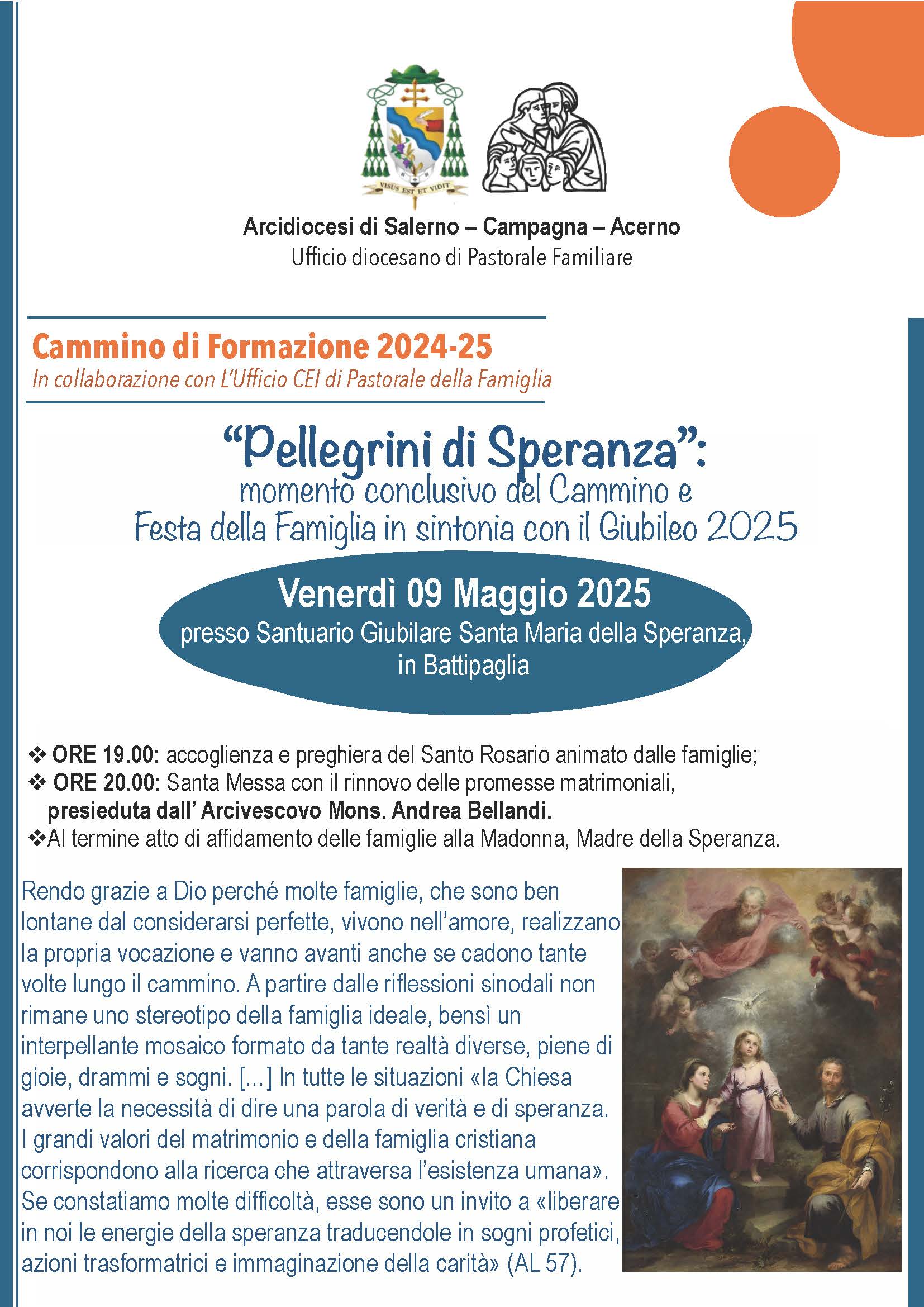 È in programma il 9 maggio 2025, presso il Santuario Giubilare "Santa Maria della Speranza" di Battipaglia, l'incontro conclusivo del Cammino di formazione proposto dall'Ufficio Diocesano di Pastorale della Famiglia, in questo anno Pastorale 2024-25. "Pellegrini di Speranza": questo il titolo dell'iniziativa che chiude il Cammino e Festa della Famiglia, in sintonia con il Giubileo 2025.
