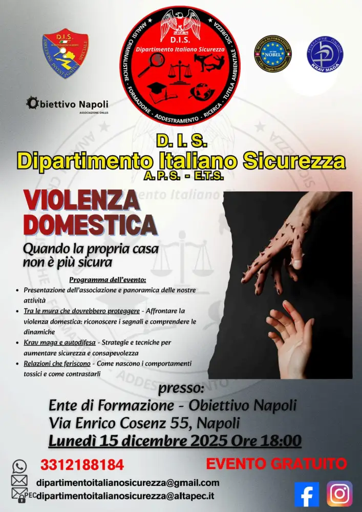 Si parlerà di violenza domestica, ma non solo, presso l'ente di formazione “Obiettivo Napoli”, il prossimo 15 dicembre alle ore 18.00.