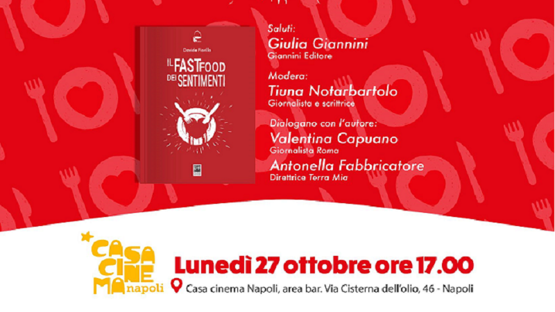 Prima e attesissima presentazione del libro “Il fast food dei sentimenti” di Davide Fiorillo, l’appuntamento è fissato presso la Casa Cinema, area bar, via Cisterna dell’olio 46 Napoli, lunedì 27 ottobre alle ore 17. Il libro è pubblicato dalla Giannini Editore nella collana La Cisterna. Dopo i saluti di Giulia Giannini della Giannini Editore, dialogheranno con l’autore le giornaliste: Valentina Capuano del Roma e Antonella Fabbricatore direttrice del quotidiano Terra Mia. Modera Tiuna Notarbartolo, giornalista e direttrice del Premio Elsa Morante.